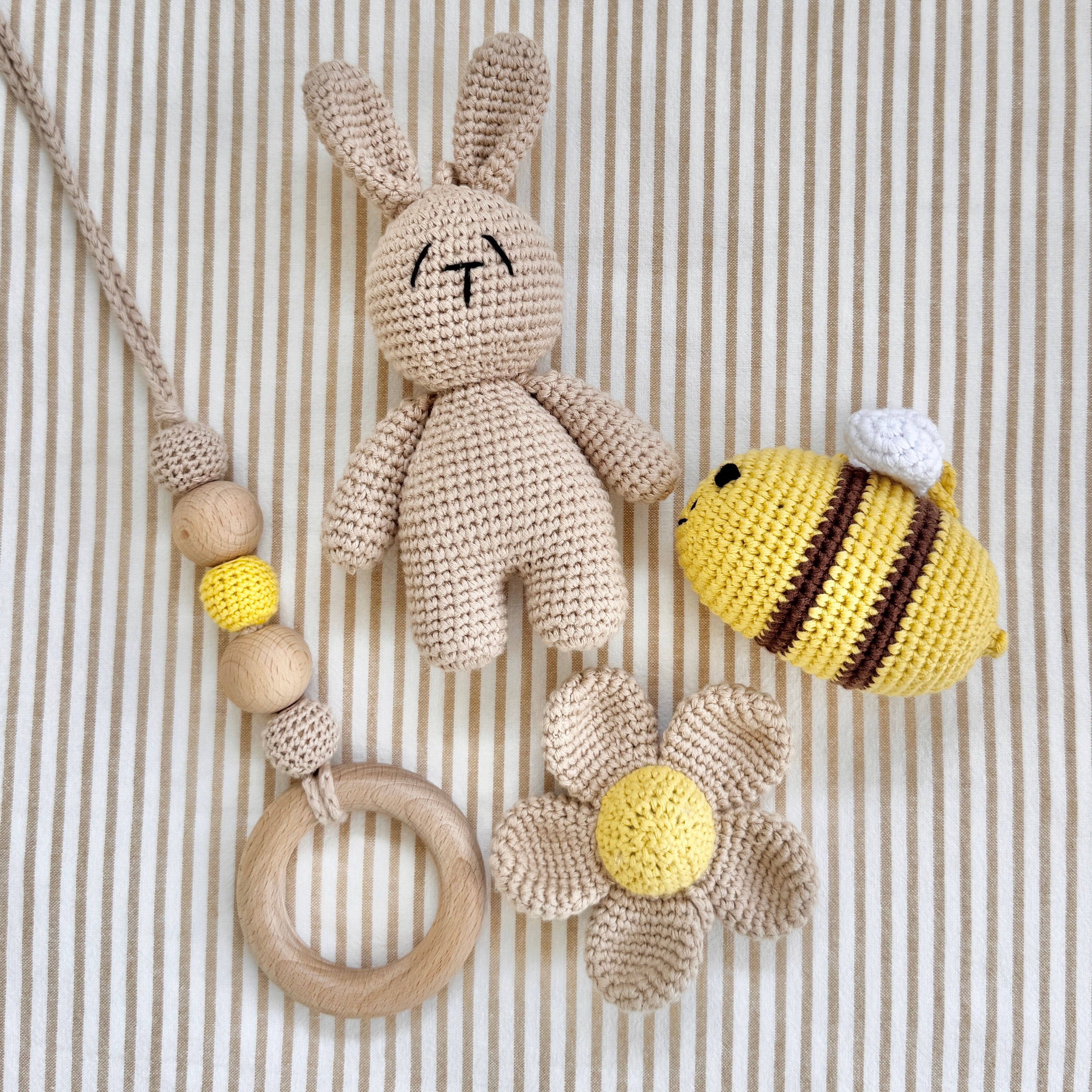 A nursery favourite, loved for its calm and modern aesthetic. Hand-crocheted bunny and bee toys come with soothing rattles inside, offering gentle sounds that encourage sensory development. Each piece is made from non-toxic materials, safe for little hands and mouths, in a neutral beige palette lifted with playful pops of yellow to brighten any space.