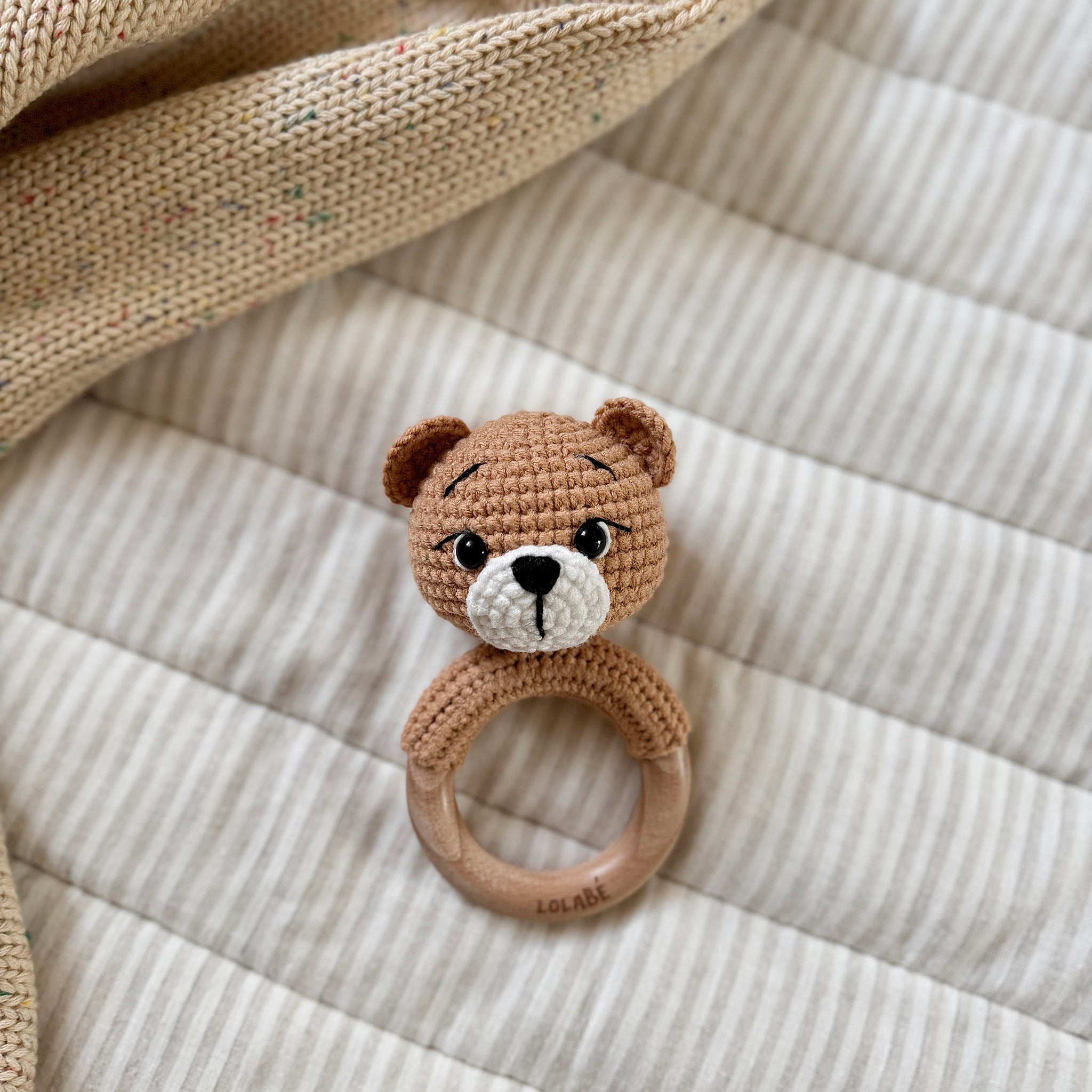 Say hello to Freddie the inquisitive bear, a charming handmade rattle designed to spark curiosity in your little one. Made from 100% cotton yarn and smooth beech wood, this non-toxic and eco-friendly rattle is perfect for tiny explorers.