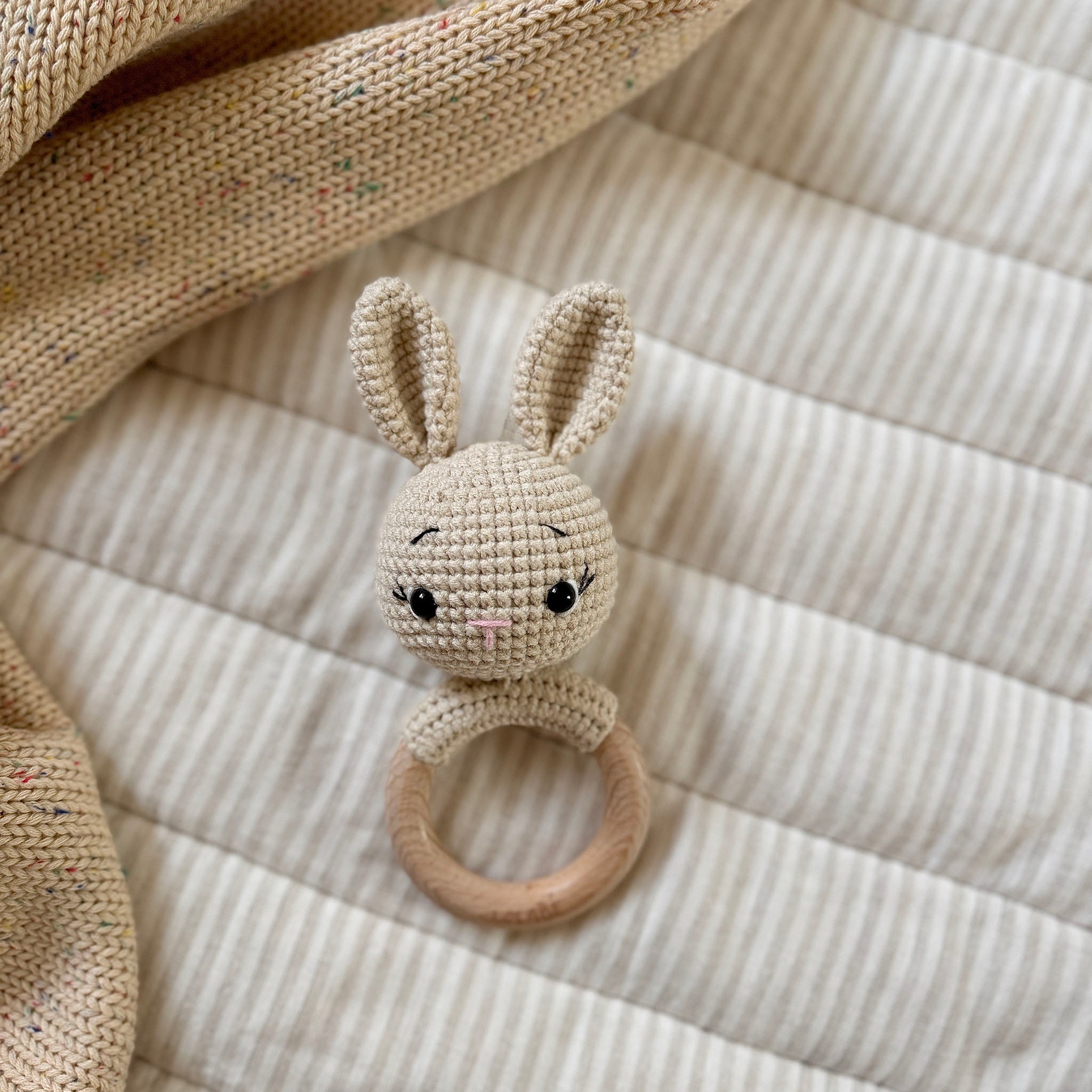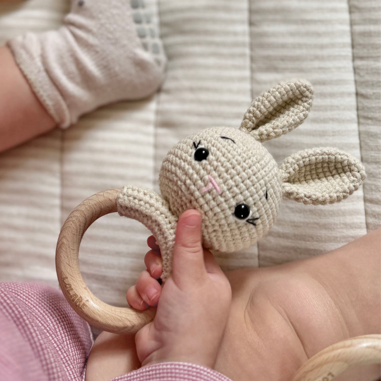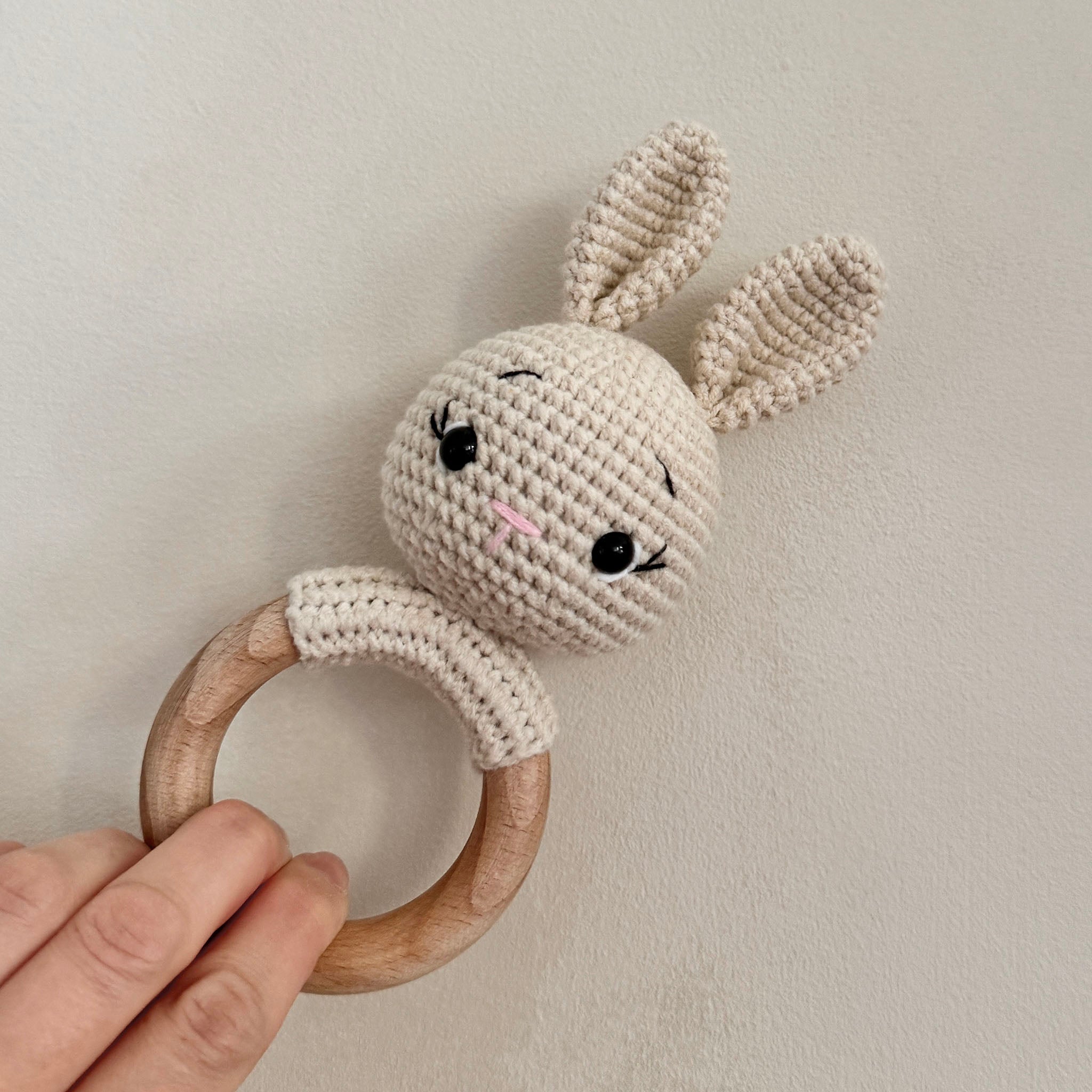 Meet Flopsy - the adventurous bunny, a delightful handmade rattle perfect for tiny hands and curious minds. Crafted with love from 100% cotton and smooth beech wood, this bunny is soft, safe, and non-toxic, making it an ideal companion for your little one's playtime.