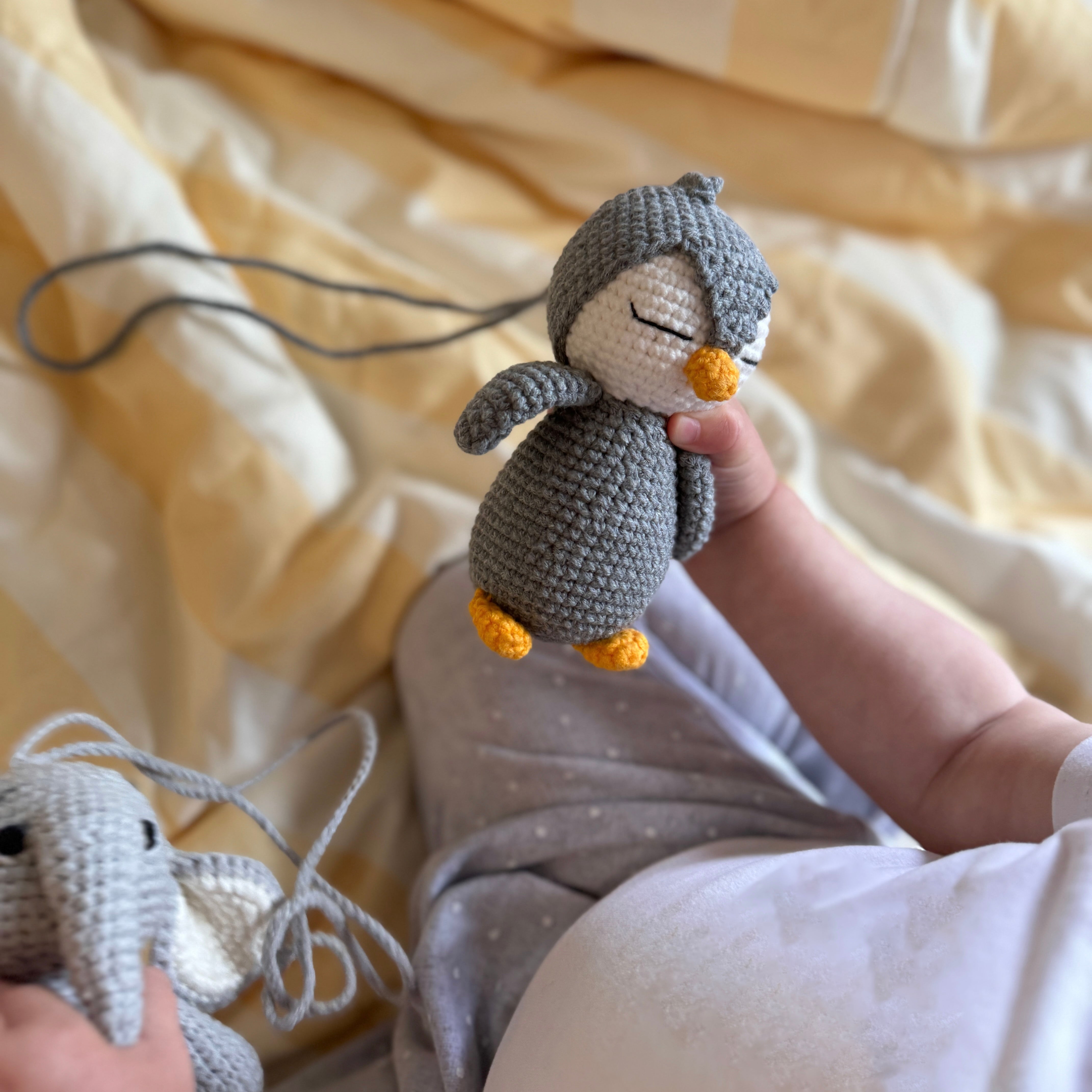 Meet the Grey Friends baby play gym set, charming duo of a soft, snuggly elephant and penguin in calming grey hues with a playful pop of orange. Crafted from high-quality cotton with a gentle rattle inside, these adorable companions encourage your little one to reach, shake, and explore, adding a touch of whimsy to playtime while perfectly complementing any nursery.