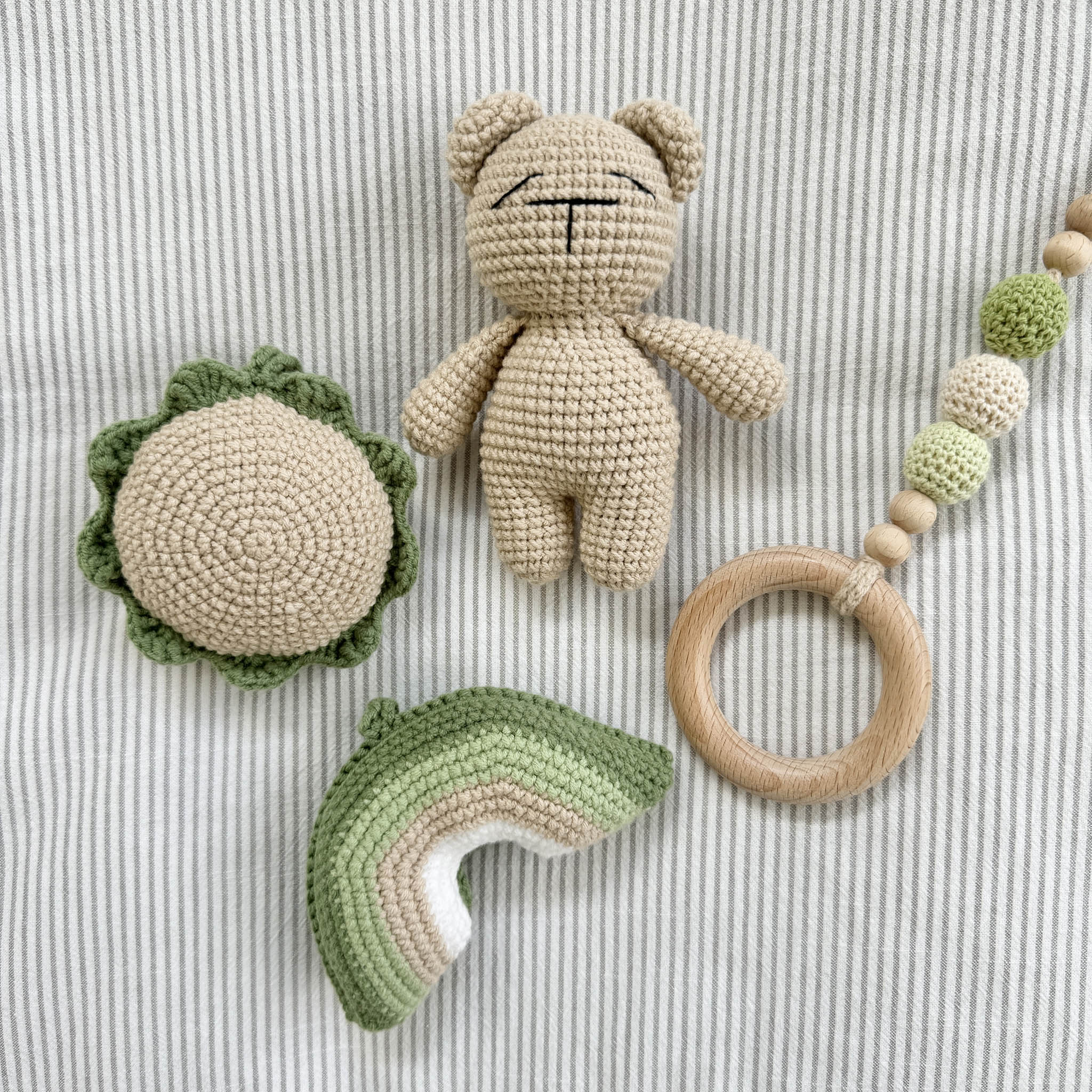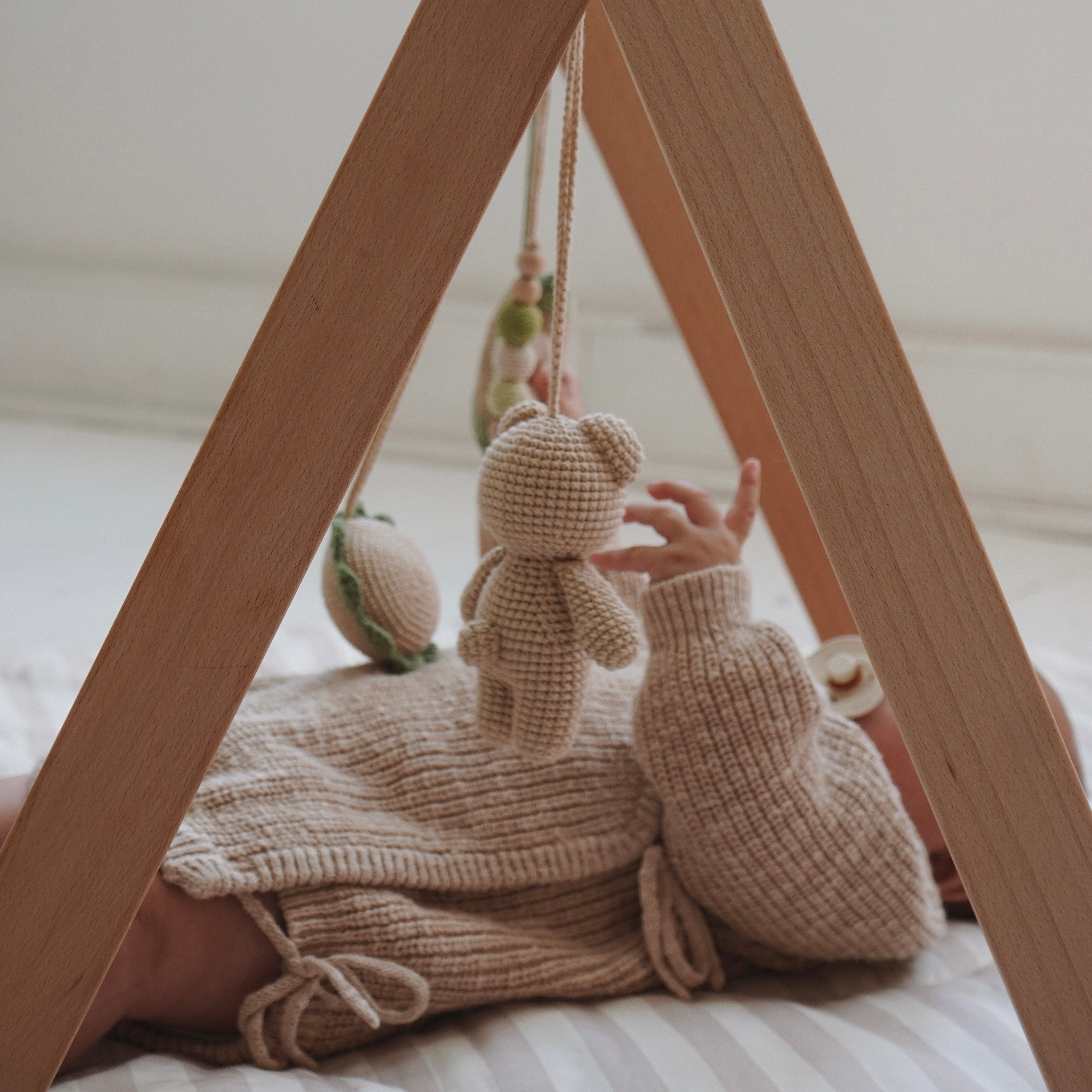 The Rainbow Bear baby play gym creates a soft and playful space for your little one. In soothing beige and green tones, it features gentle rattles to engage your baby’s senses. Made from safe, non-toxic materials, it brings both peace of mind and a beautiful touch to the nursery.
